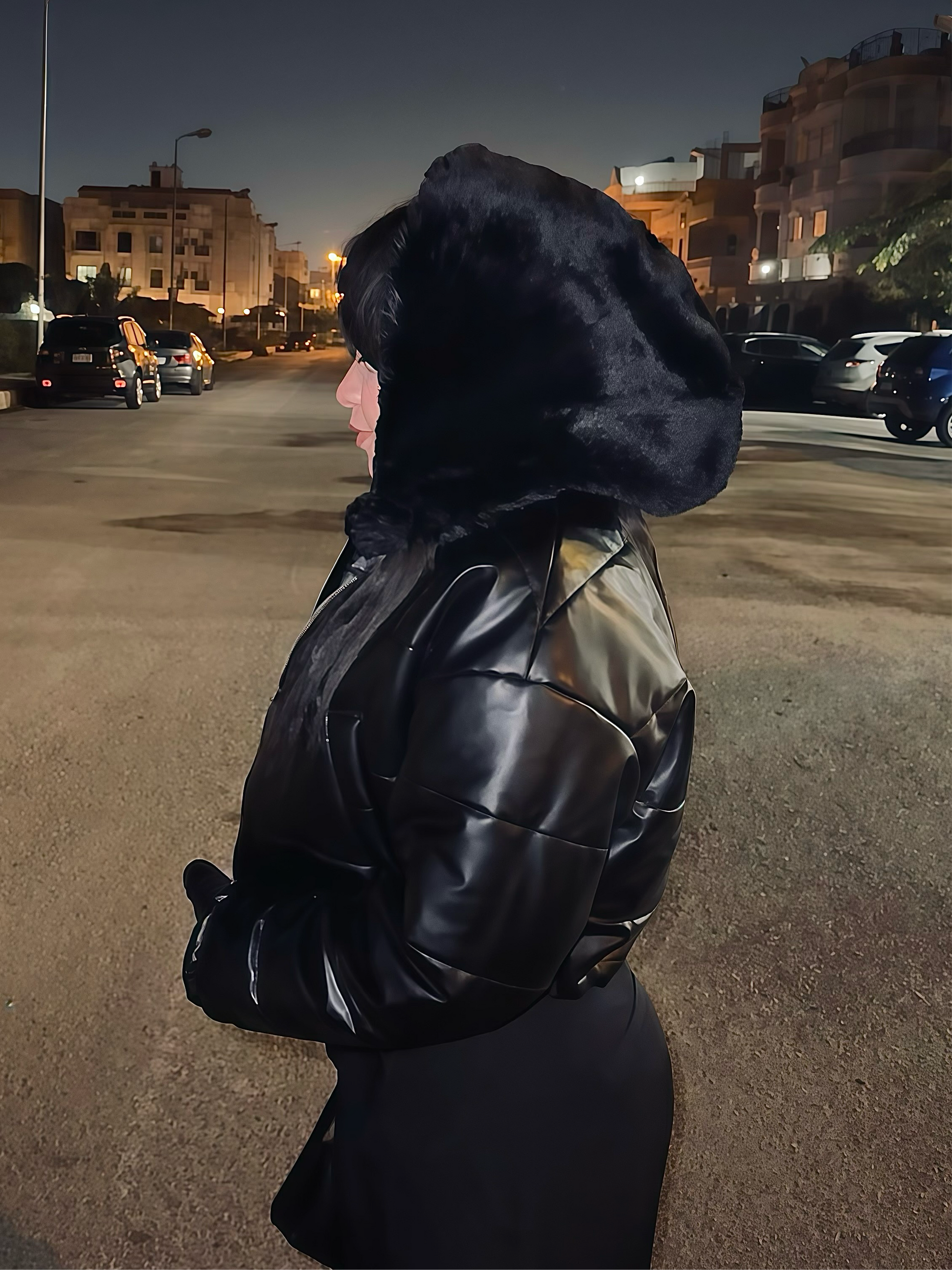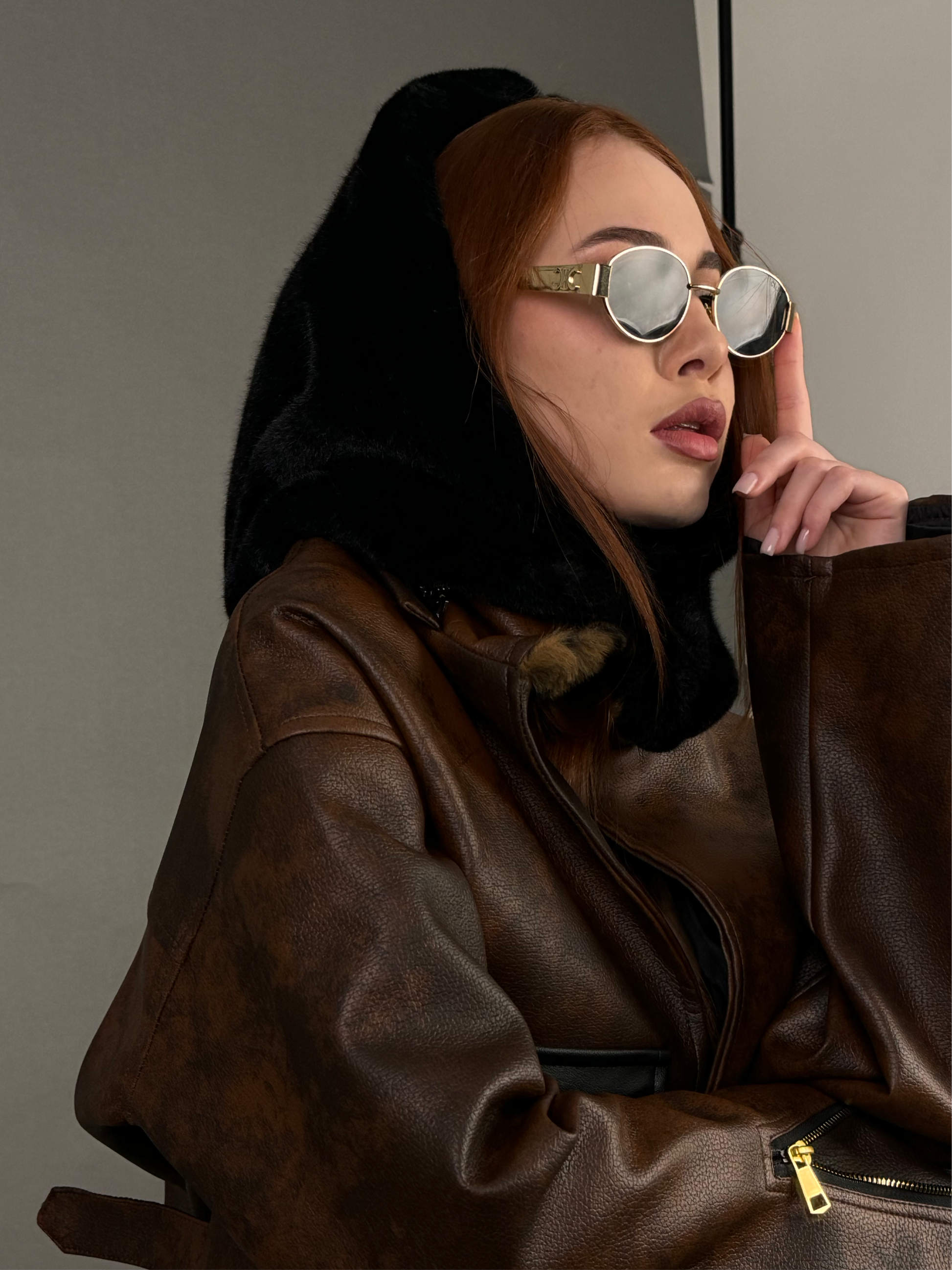 Portable fur hood with a gold pin.
